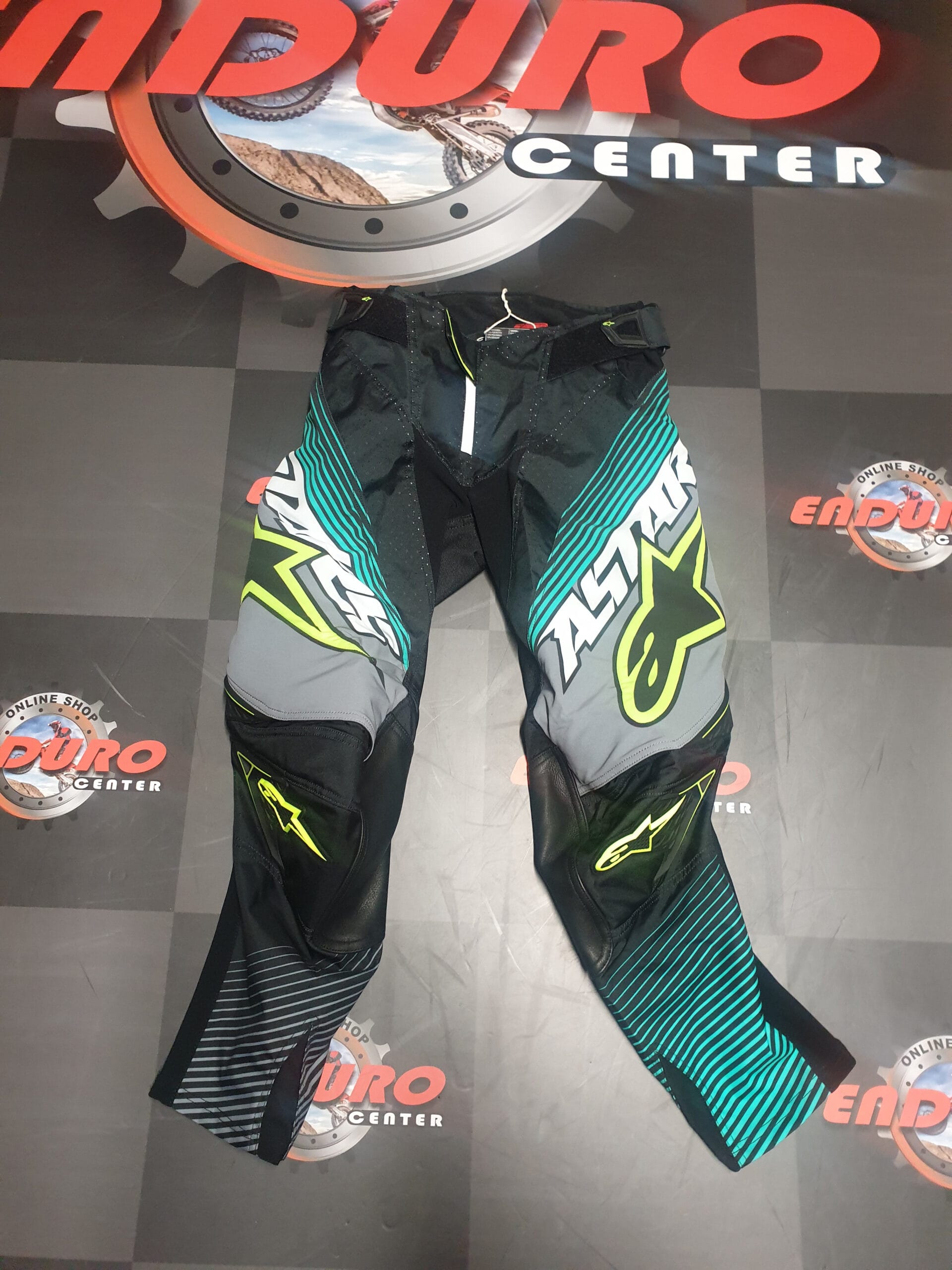 CALÇA ALPINESTARS TECHSTAR FACTORY – PRETO/CINZA ESCURO/VERDE TURQUESA