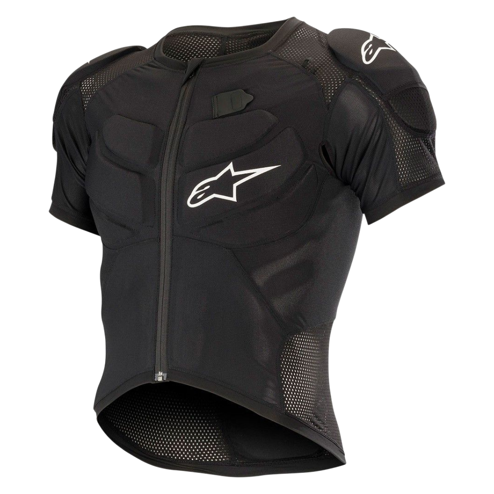 O acolchoamento macio distribuído por todo o corpo e a lateral são reforçados para maior absorção de impactos e conforto. O design de manga curta permite o uso de cotoveleiras Alpinestars, compatíveis com BNS quando utilizadas com fitas X ou A. Bolso acolchoado com fecho de correr nas costas para armazenamento seguro.